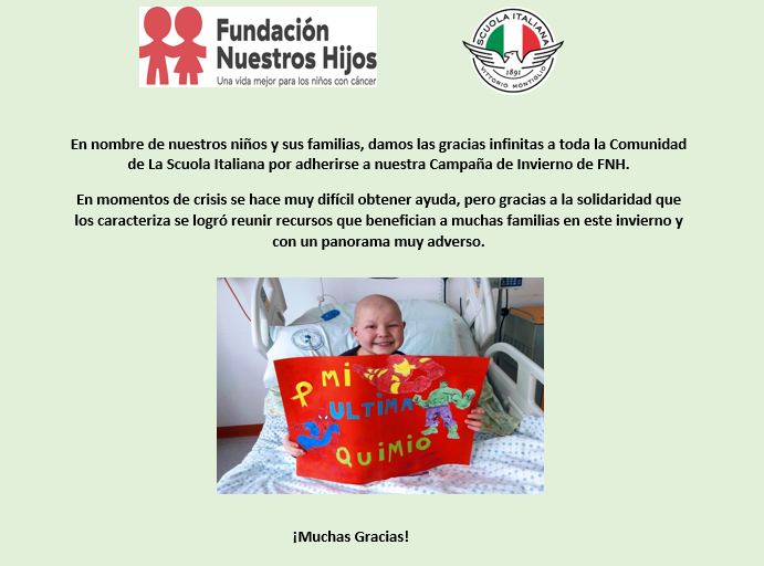 En nombre de nuestros niños y sus familias, damos las gracias infinitas a toda la Comunidad de La Scuola Italiana por adherirse a nuestra Campaña de Invierno de la Fundación Nuestros Hijos.