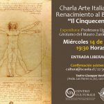 El 14 de junio a las 19:30 Hrs. se realizará la segunda sesión del ciclo gratuito de conferencias “Arte Italiano del Renacimiento al Barroco”, impartido por la ex alumna y profesora Ughette De Girolamo del Mauro Zunino.