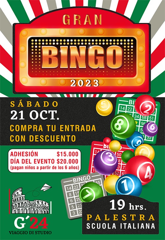La Comisión Viaggio di Studio G24, los invita a participar del Gran Bingo Scuola 2023, que este año se realizará el sábado 21 de octubre a las 19:00 Hrs. en la Palestra.