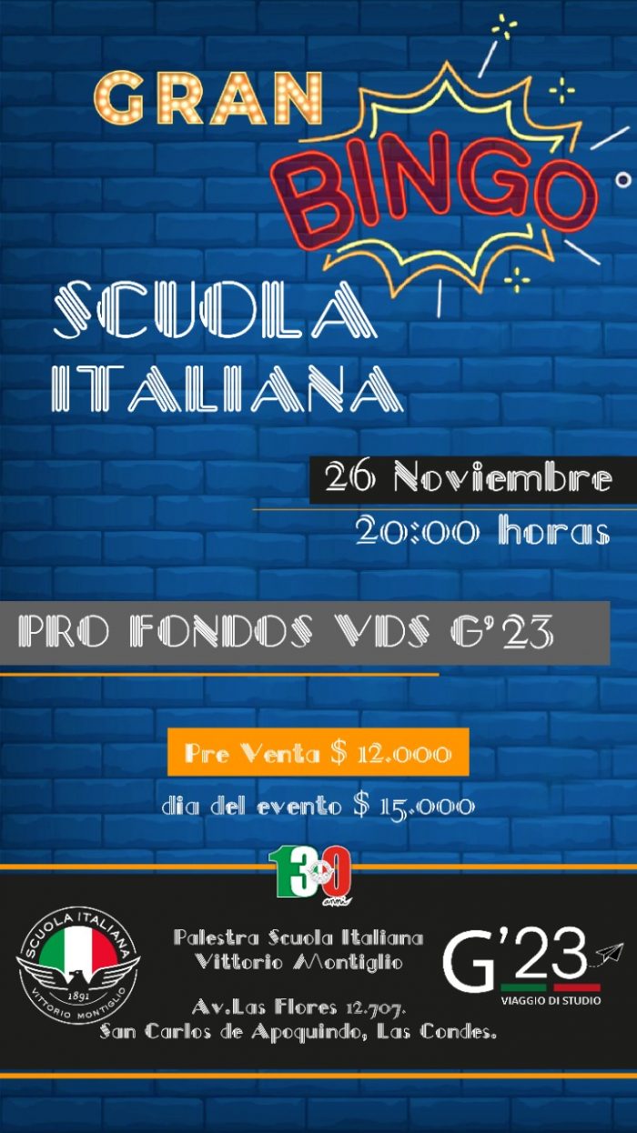 La Comisión Viaggio di Studio G23, los invita a participar del Gran Bingo Scuola 2022, que este año se realizará el sábado 26 de noviembre a las 20:00 Hrs. en la Palestra.