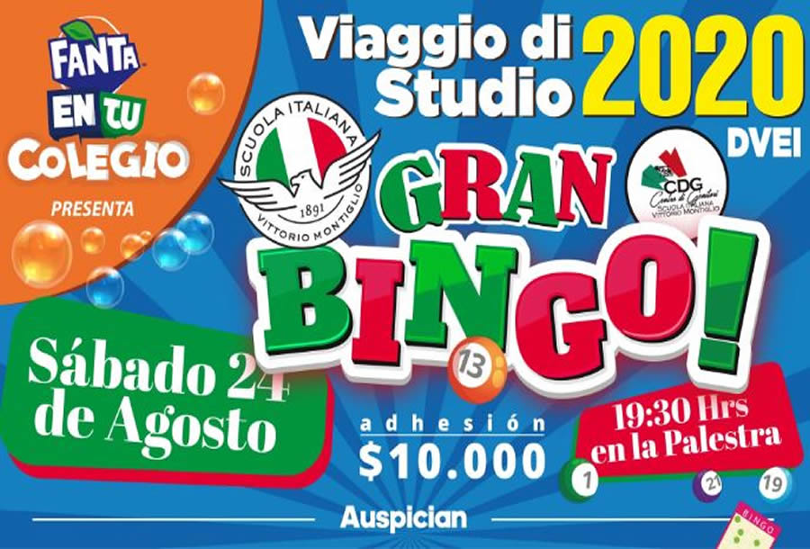 La Comisión Viaggio di Studio 2020, los invita a participar del Gran Bingo Scuola 2019, que este año se realizará el sábado 24 de agosto a las 19:30 Hrs. en la Palestra. Tendremos fabulosos premios y muchas sorpresas!