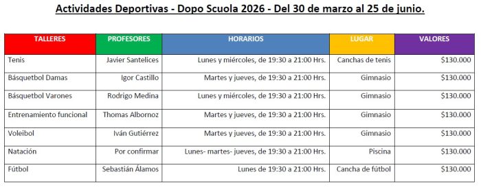 Invitamos a todos los apoderados y ex alumnos a sumarse y participar en las Actividades Deportivas “Dopo Scuola 2026”, programadas para este Primer Semestre. Una excelente oportunidad para disfrutar del deporte.