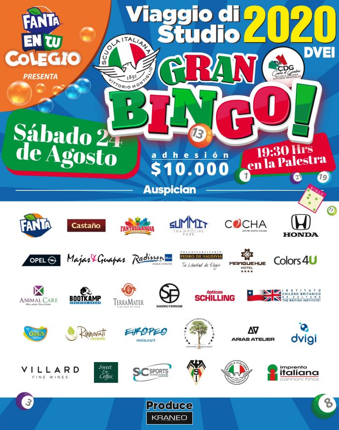 La Comisión Viaggio di Studio 2020, los invita a participar del Gran Bingo Scuola 2019, que este año se realizará el sábado 24 de agosto a las 19:30 Hrs. en la Palestra.
