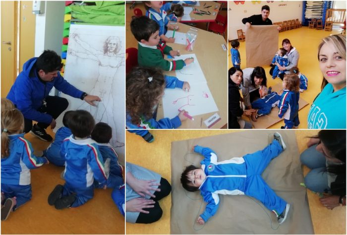 Durante las clases de psicomotricidad de los Grupos 2,3,4 y 5 de la Scuola Nido, y con el fin de trabajar la Unidad «Conocimiento del cuerpo humano», el Depto. de Ed. Física realizó distintas actividades inspiradas en la obra “El hombre de Vitruvio” de Leonardo da Vinci, a propósito de los 500 años de su muerte.