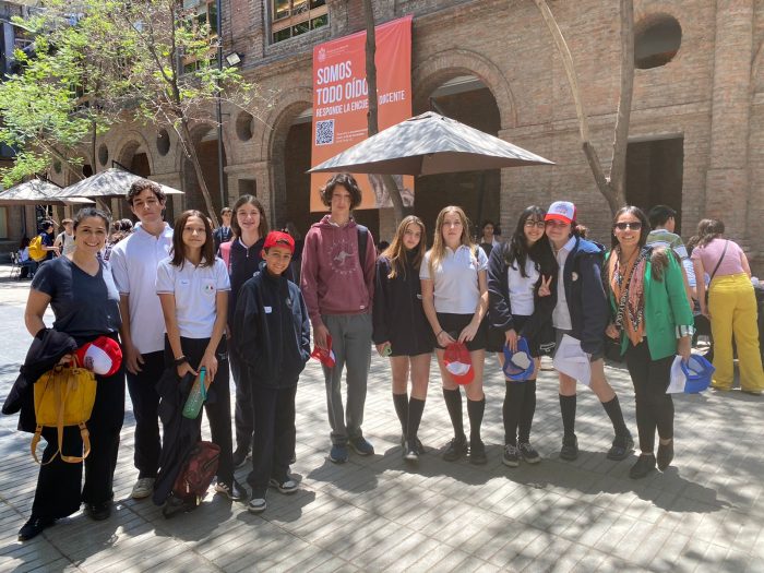 Un grupo de estudiantes, acompañados por Isadora Espinosa, Coordinadora del Depto. de Formación y Sandra Ortiz, Orientadora, asistieron a las primeras Olimpiadas de Bienestar Emocional Escolar en la casa central de la Universidad Católica.