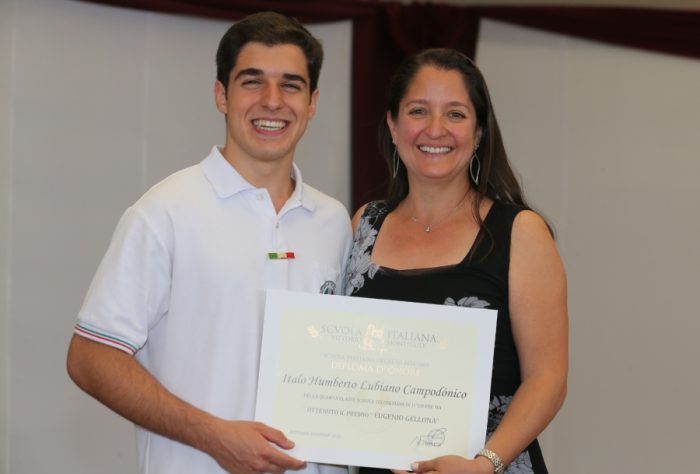 Para finalizar se llevó a cabo el momento más esperado de esta ceremonia, la entrega del Premio Gellona, distinción máxima que otorga nuestro colegio, al alumno que durante su trayectoria escolar demostró representar el “Espíritu Scuola”. Este año el premio recayó en el alumno Italo Lubiano Campodónico del IVB.