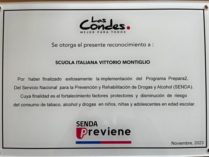 El martes 28 de noviembre, la Scuola recibió la certificación de la implementación del Programa Prepara2 de SENDA PREVIENE, en el cual se ha estado trabajando hace dos años y que busca fortalecer factores protectores y disminuir factores de riesgo en consumo de tabaco, alcohol y drogas en los estudiantes en edad escolar.